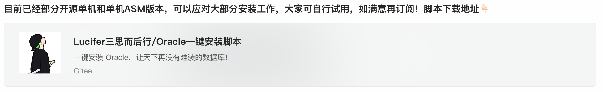 Oracle 一键安装脚本已经部分开源(单机):https://gitee.com/luciferlpc/OracleShellInstall