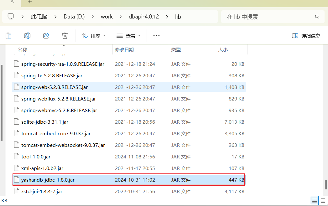 将下载的驱动包yashandb-jdbc-1.8.0.jar手动放入DBApi部署后的**<font style="color:rgb(71, 101, 130);">lib</font>**目录下