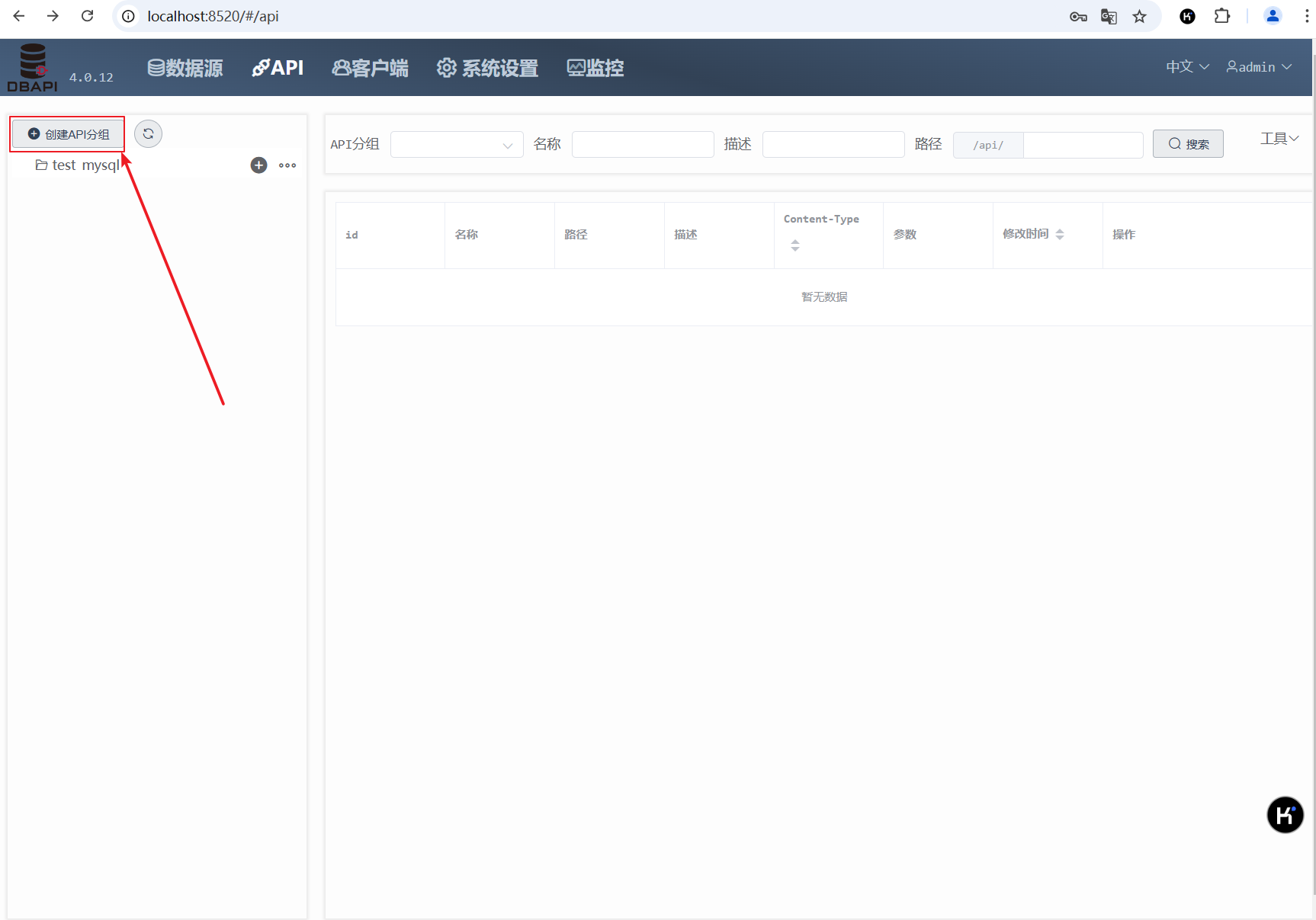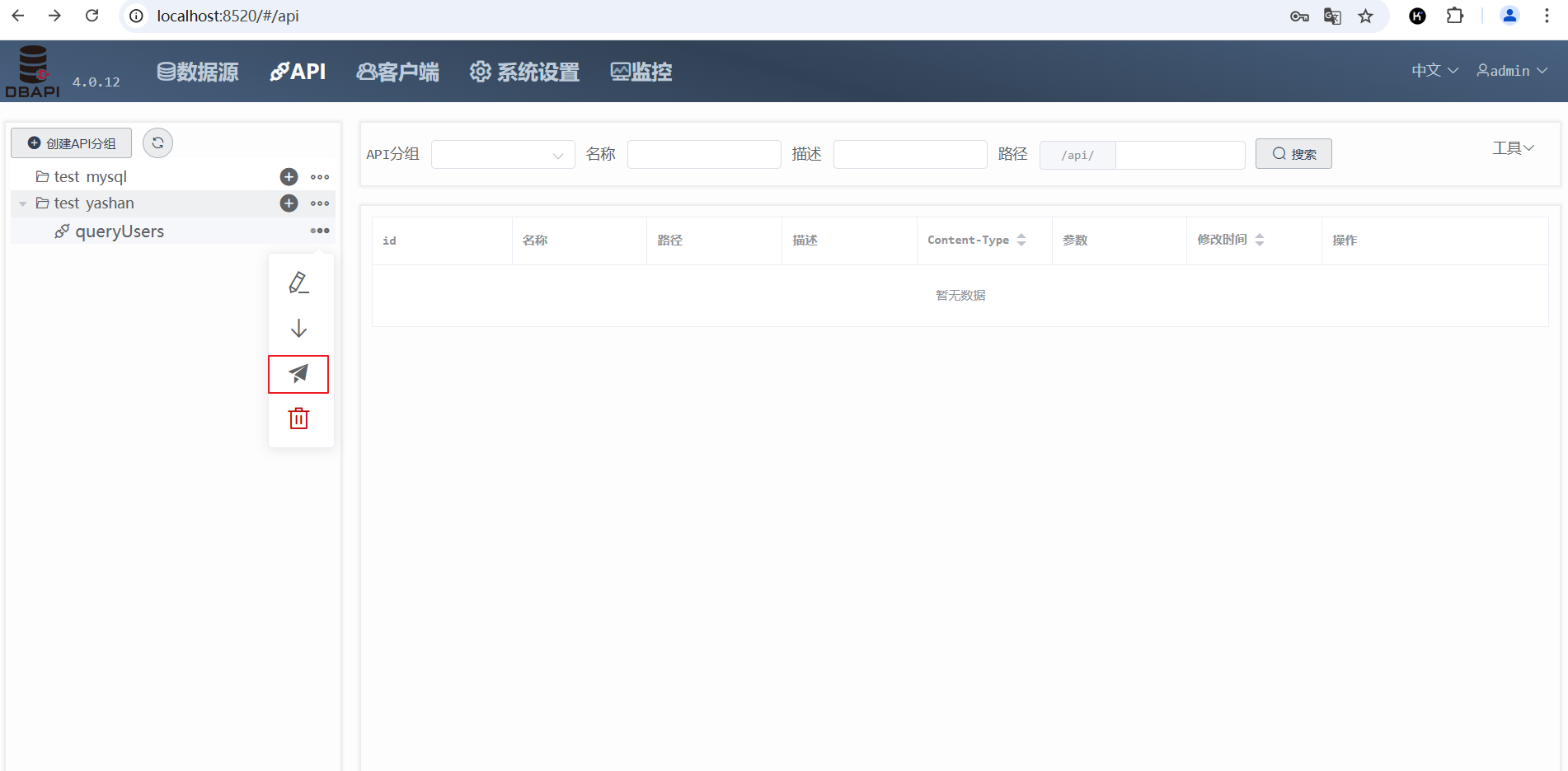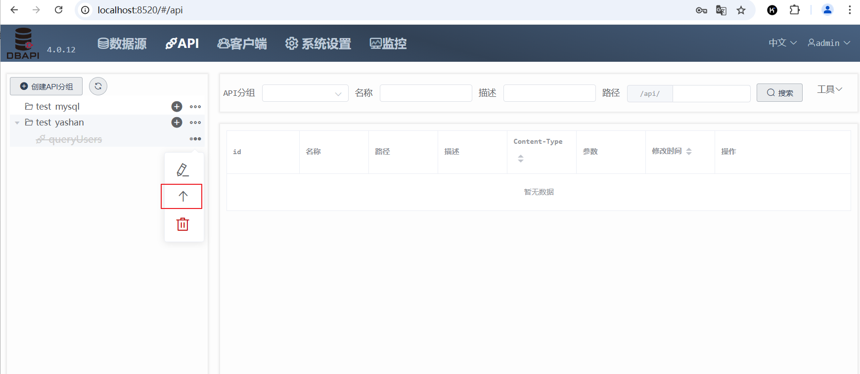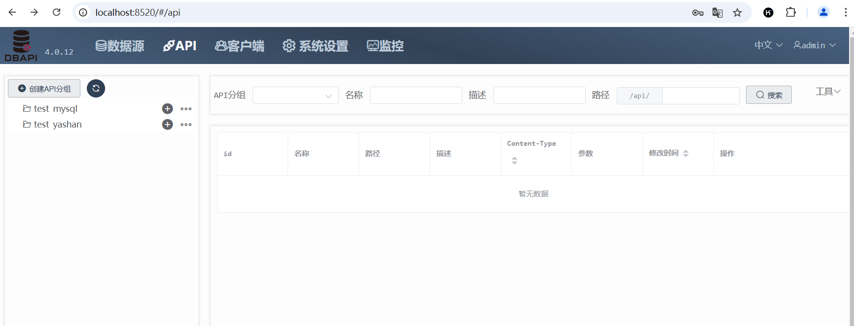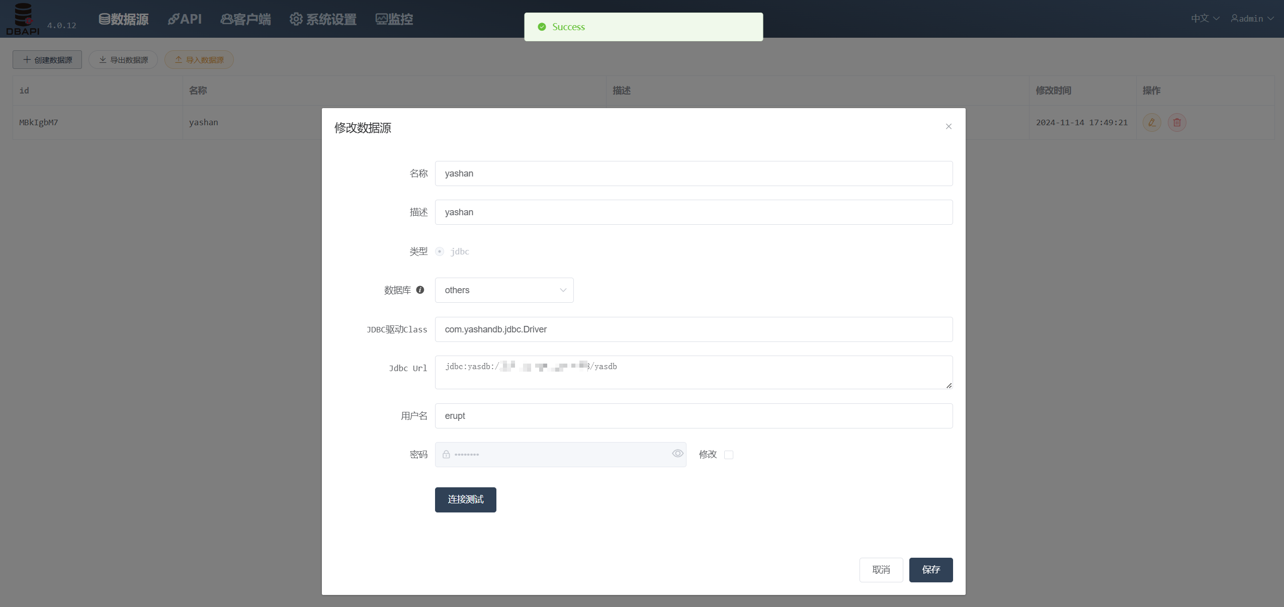重新登录DBApi的web页面,本地部署则访问:http://127.0.0.1:8052/,使用初始账户密码admin/admin登录,进行DBApi开发YashanDB数据库API